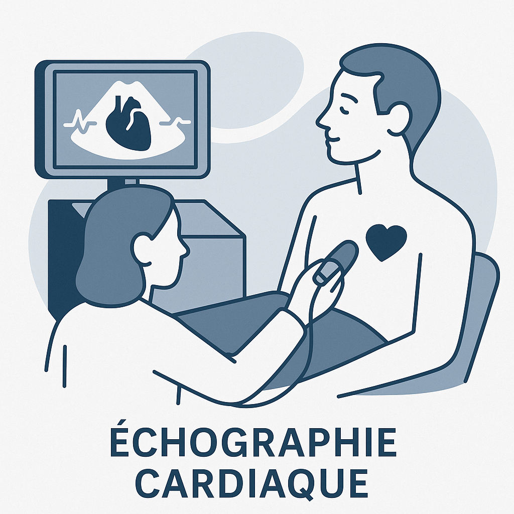 L’échographie cardiaque (ou échocardiogramme) est un examen d’imagerie utilisant les ultrasons pour visualiser en temps réel les cavités, les valves et la fonction de pompage du cœur. Elle permet de dépister ou de suivre : insuffisance cardiaque, pathologies valvulaires, anomalies congénitales, cardiomyopathies, présence d’épanchement péricardique, etc.